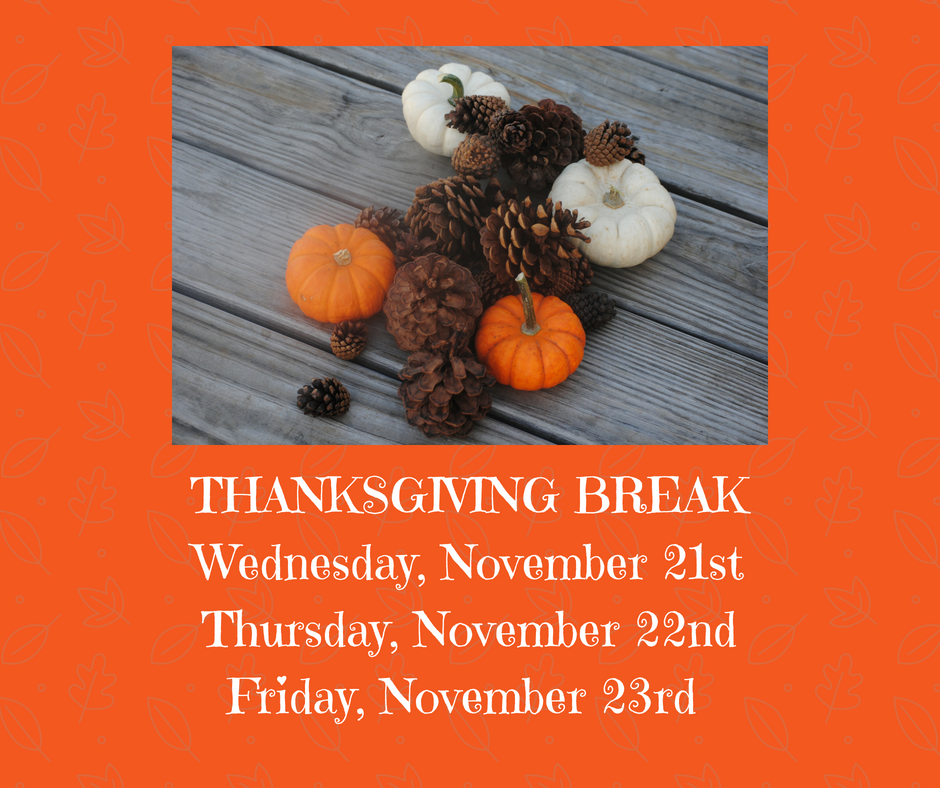 School will be closed from Wednesday, November 21st through Friday, November 23rd for Thanksgiving Break.