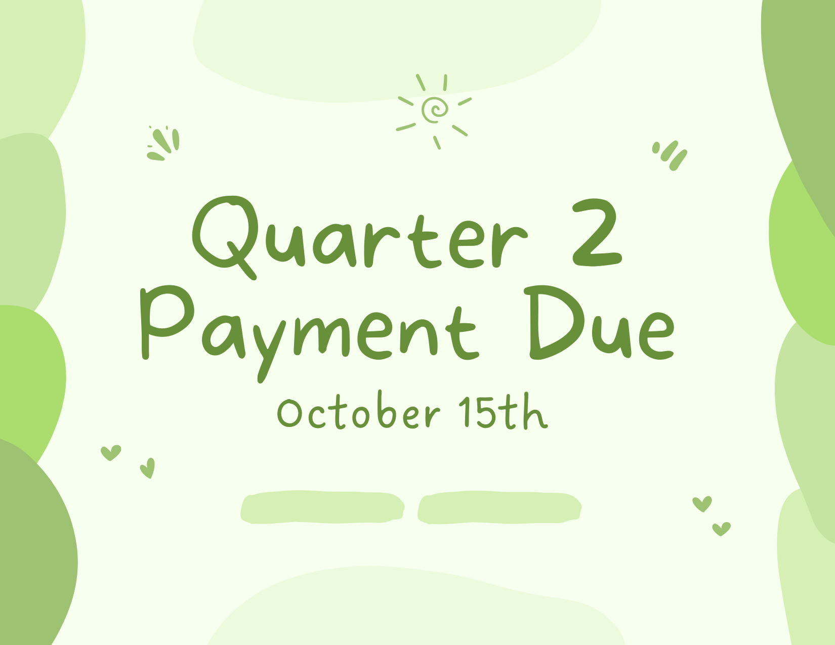 Back to All Events Quarter 2 Payments Due Sunday, October 15, 2023 9:00 AM 1:00 PM Google Calendar ICS